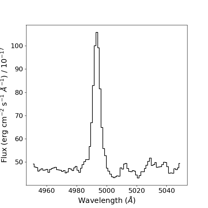 Since we're interested in individual emission lines, let's have a look at one, namely Hβ. Keep in mind that because the galaxy is redshifted, we need to account for this when choosing the wavelength of our line. We can select the wavelength region around the (redshifted) Hβ line using NumPy slicing and plot the results: