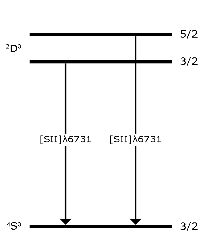 We can define a `critical density' for a given transition within an ion: this is the electron density for which the rates of collisional and radiative de-excitation are approximately equal. The relative strength of two emission lines that arise from transitions from closely-spaced upper energy levels to the same lower energy level will not depend too much on temperature, but will strongly depend on the density of the gas and the critical densities of the transitions. Therefore, by measuring the flux ratio of two such emission lines (such as the [SII]λλ6717,6731 doublet; see Figure 1), we can determine the electron density of the gas by comparing the measured ratio to that expected from atomic physics - this is perhaps made clearer by plotting the variation of the [SII]λλ(6717/6731) ratio against electron density: